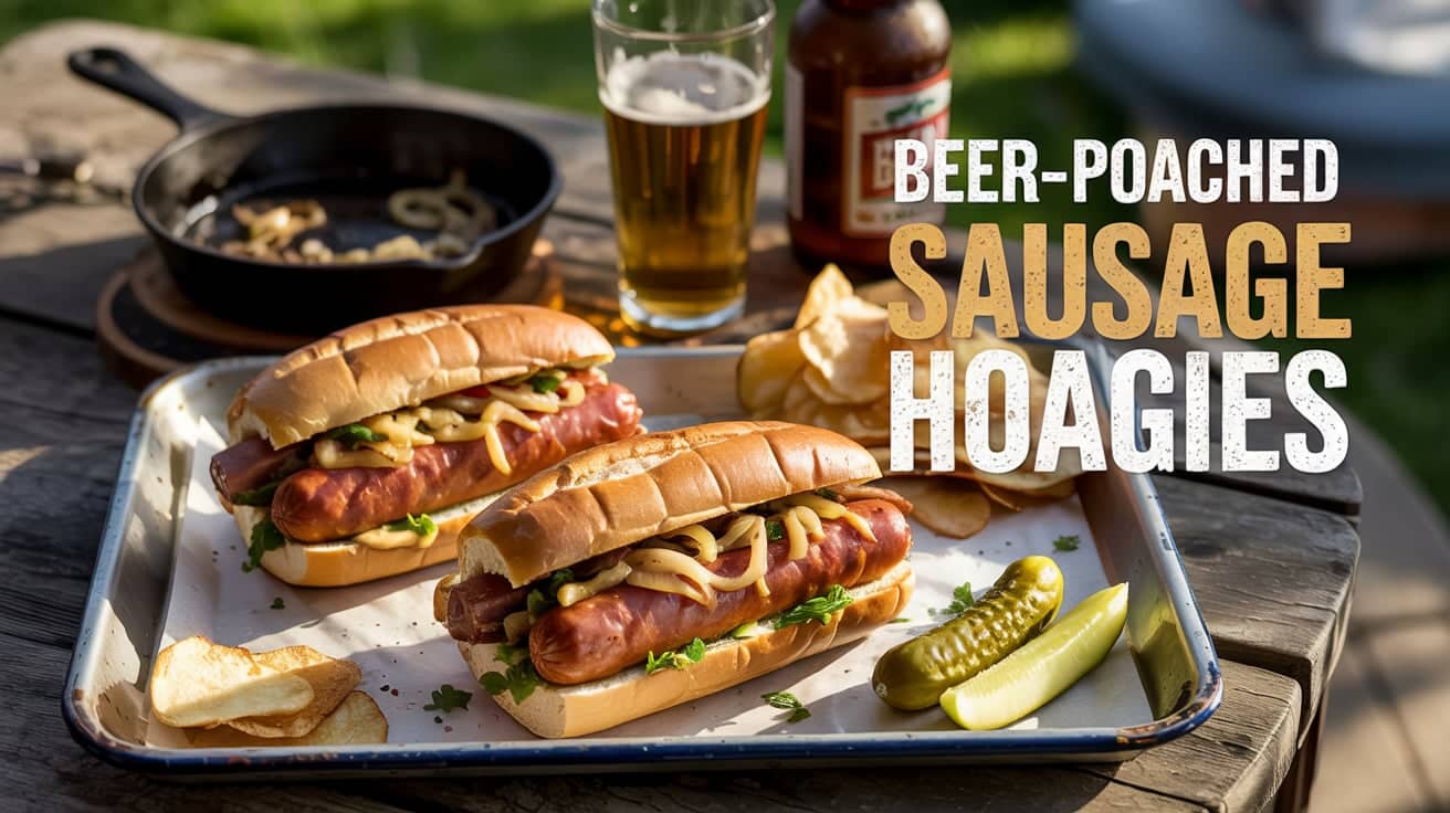 Beer-Poached Sausage Hoagies are juicy, bold, and endlessly riffable — they’re the “use what’s in the fridge” hero of beer-and-bun cooking.