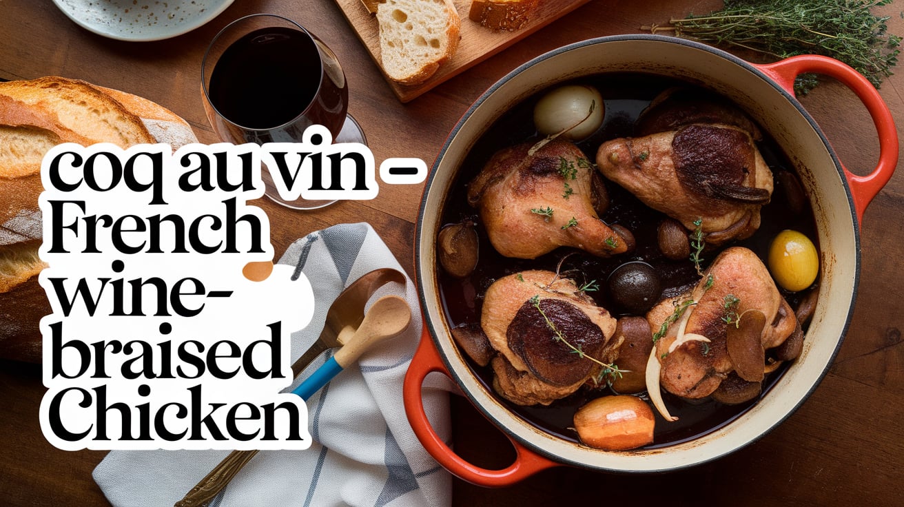 Coq au Vin is the ultimate French comfort dish — chicken slow-braised in red wine with mushrooms, pearl onions, and smoky bacon until the meat is tender and the sauce is rich and savory.