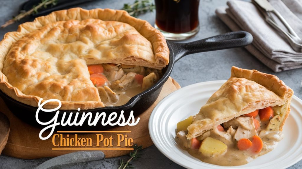 A creamy Guinness-based gravy surrounds chicken, carrots, and peas, all tucked under a flaky, golden crust.