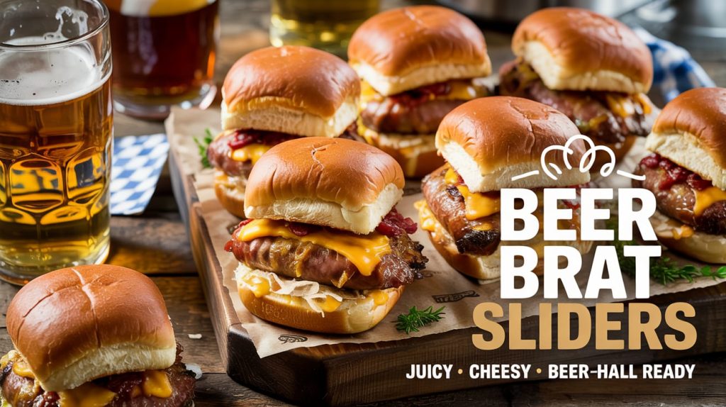 Mini buns, grilled beer brats, beer caramelized onions, beer mustard — and maybe a pretzel bun.