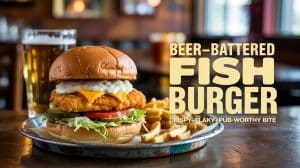 - Beer-Battered Fish Burger 🐟🍺 Crispy Golden Fish, Malty Beer Batter, and Creamy Sauce Between Toasted Buns